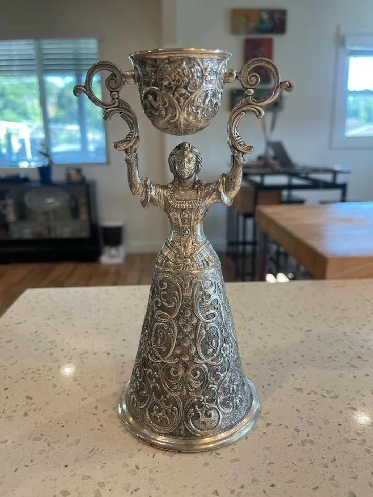 Un objet décoratif avec un petit gobelet mobile a intrigué son propriétaire. Il s’agit en réalité d’une coupe de mariage traditionnelle japonaise permettant aux mariés de boire en même temps afin de symboliser leur union.