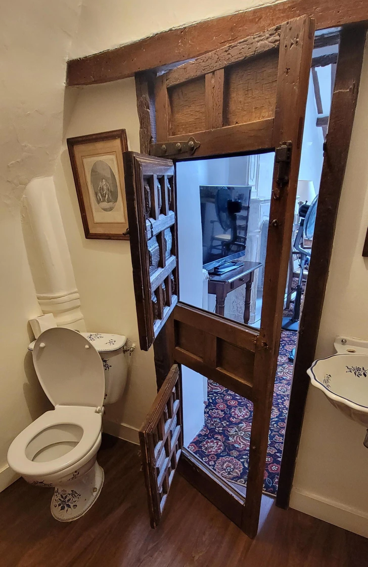 Dans une chambre, des visiteurs ont remarqué des portes particulières coupées horizontalement. Ce sont des portes hollandaises, conçues pour ouvrir seulement la partie supérieure afin de laisser passer l’air et la lumière tout en empêchant les enfants ou les animaux de sortir.
