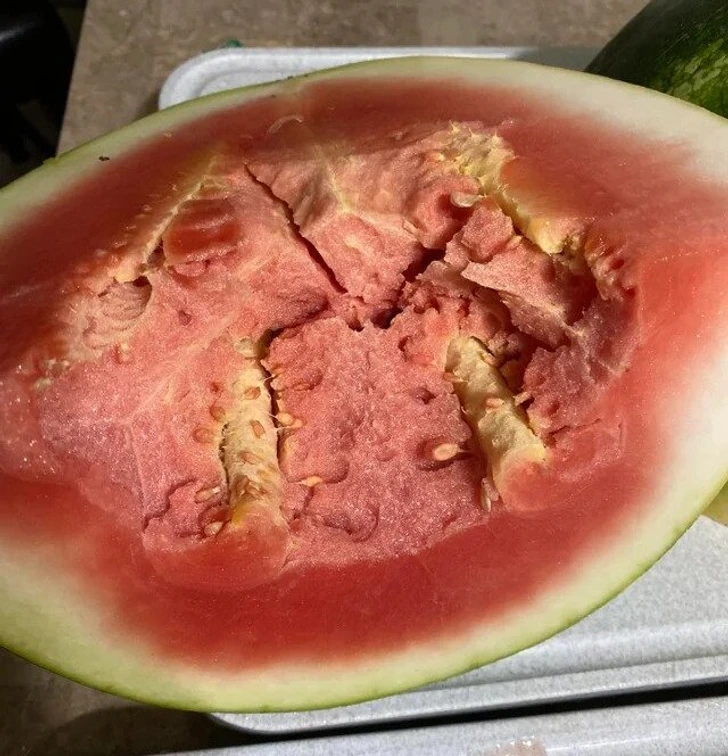 Une personne a partagé la photo d’une pastèque dont l’intérieur semblait très inhabituel. Les internautes ont expliqué que cela peut arriver lorsque le fruit subit des variations importantes de température ou d’arrosage pendant sa croissance, ce qui modifie la formation de la chair et son aspect.