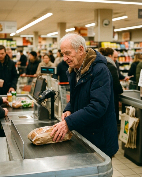 Dans la file de la caisse, mon attention a été attirée par un monsieur d’un certain âge qui se tenait devant moi. Son panier était des plus modestes : une baguette, un litre de lait, un pot de pâte à tartiner. Des achats basiques, qui m’ont soudain paru empreints d’une certaine solitude.