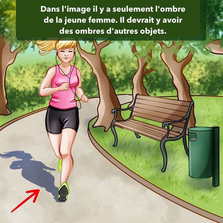 Revenons à notre joggeuse. Avez-vous examiné l’image avec soin ? Penchons-nous sur un détail souvent négligé : la présence des ombres. Sur l’illustration, la sportive projette bien son ombre, comme on s’y attend. Mais qu’en est-il de celles des arbres ? Des bancs ? Du reste du décor ? Étonnant, non ?