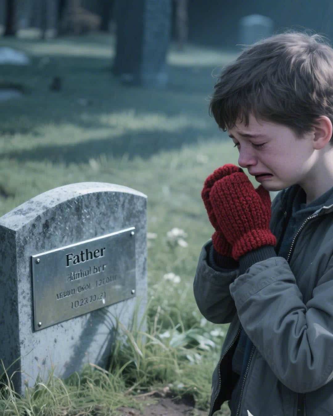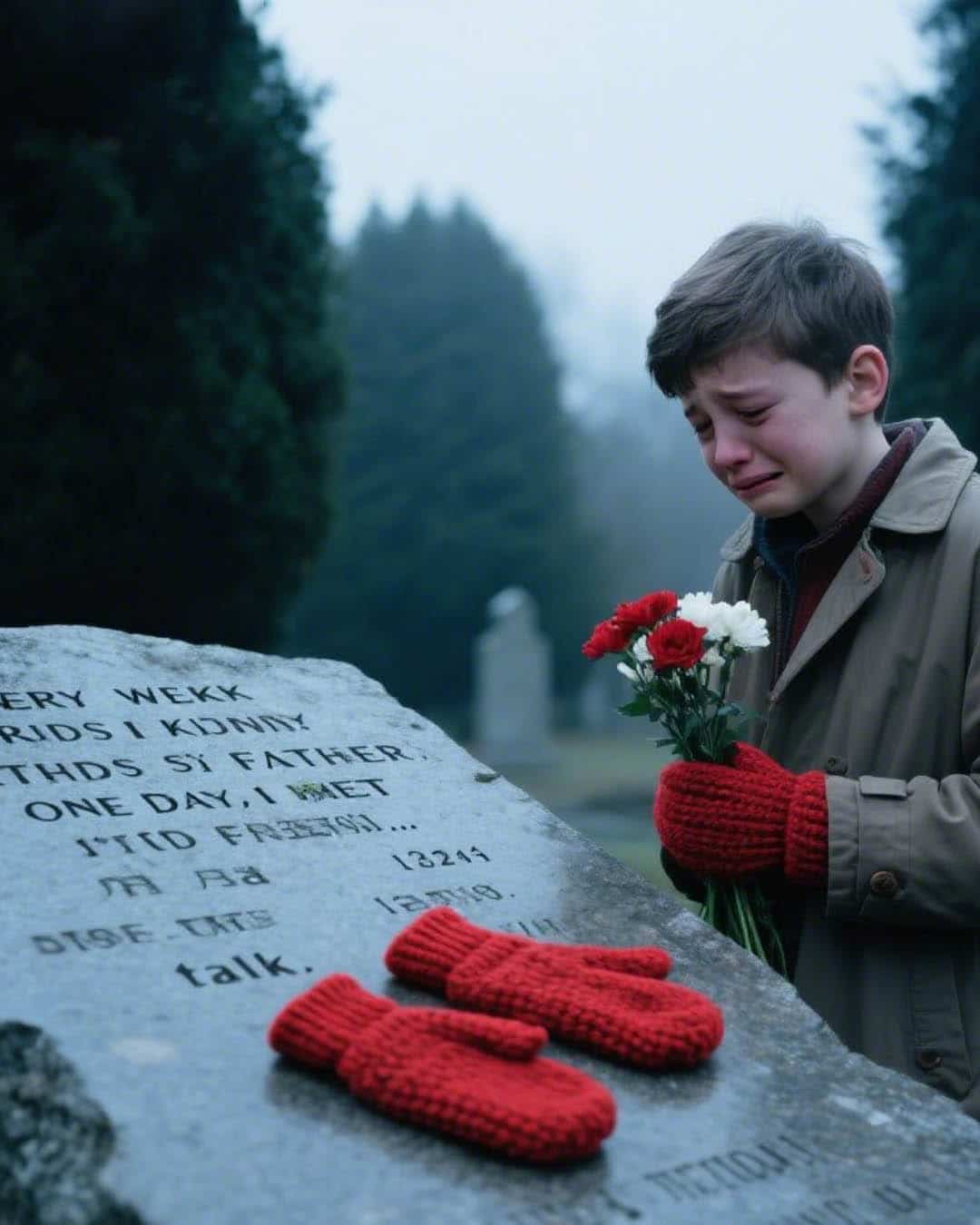 Un jeune garçon veillait sur la sépulture paternelle, une paire de mitaines à la main