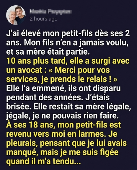 J'ai consacré mon cœur à élever ce petit garçon, jusqu'au jour où il m'a été retiré. Des années de silence et de vide ont suivi, jusqu'à cette visite qui a tout bouleversé. Parfois, les liens les plus profonds résistent à tout.