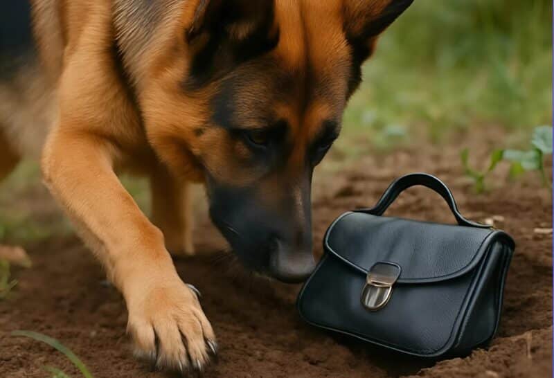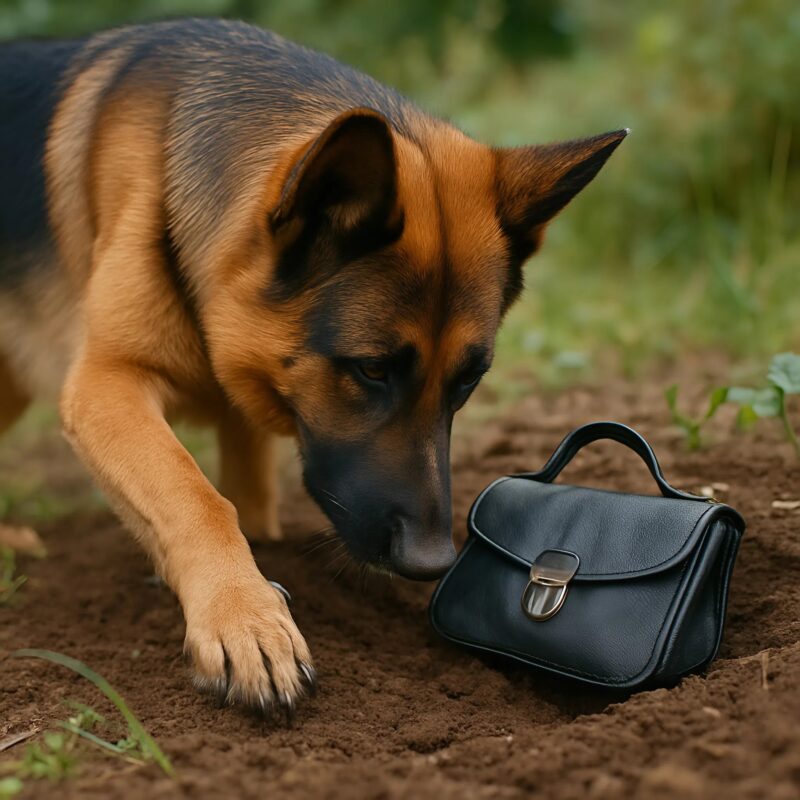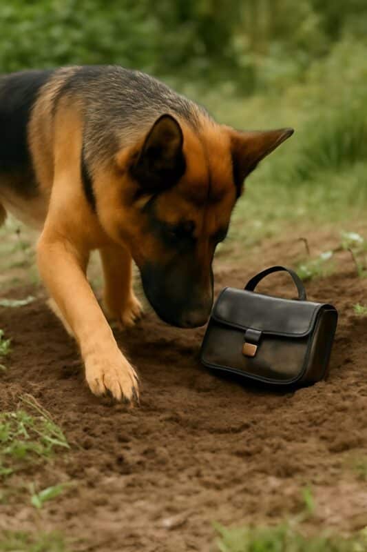 Puis son comportement a basculé : son museau s’est figé près du sol, son corps s’est tendu, toute son attention captée par quelque chose d’imperceptible pour moi. En m’approchant, j’ai aperçu la forme à demi enterrée d’un sac en cuir sombre, visiblement placé là non par accident, mais avec une intention précise.