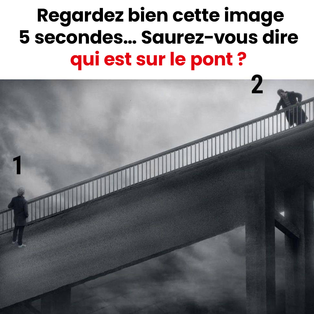 Prenez quelques instants pour analyser la composition. L’idée est de répondre instinctivement, sans trop d’analyse. La consigne est claire : qui se tient réellement sur le pont ? Pas à côté, pas en dessous, mais précisément sur l’édifice lui-même.