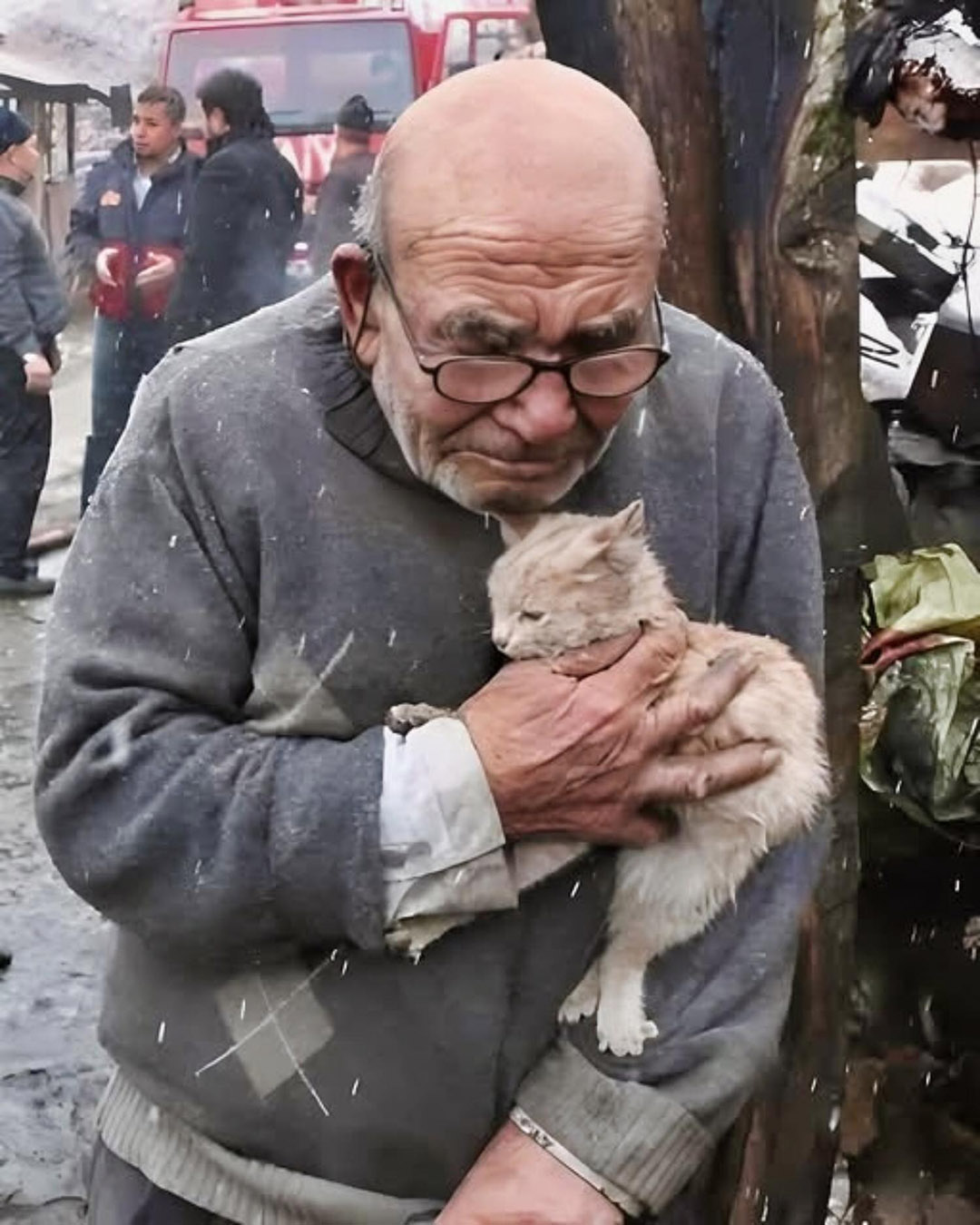 L’air était lourd d’une fumée persistante, qui se mêlait à l’humidité de la pluie récente. Un manteau de neige, souillé par la suie et les débris, recouvrait le sol, offrant une vision d’une tristesse infinie. Au milieu de ce chaos figé, un homme restait immobile, serrant contre lui un petit chaton caché sous son manteau.