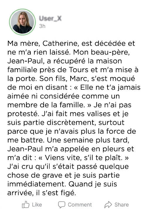 Puis, la sentence est arrivée : Jean-Paul, son beau-père, héritait de la maison, des comptes et des investissements.