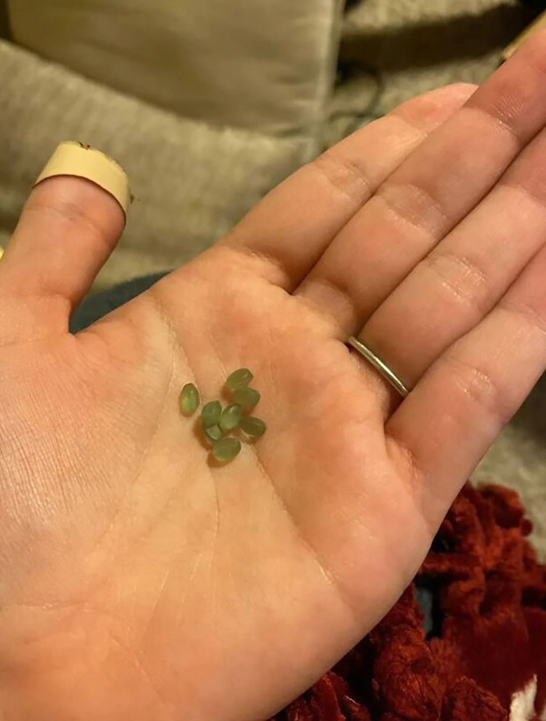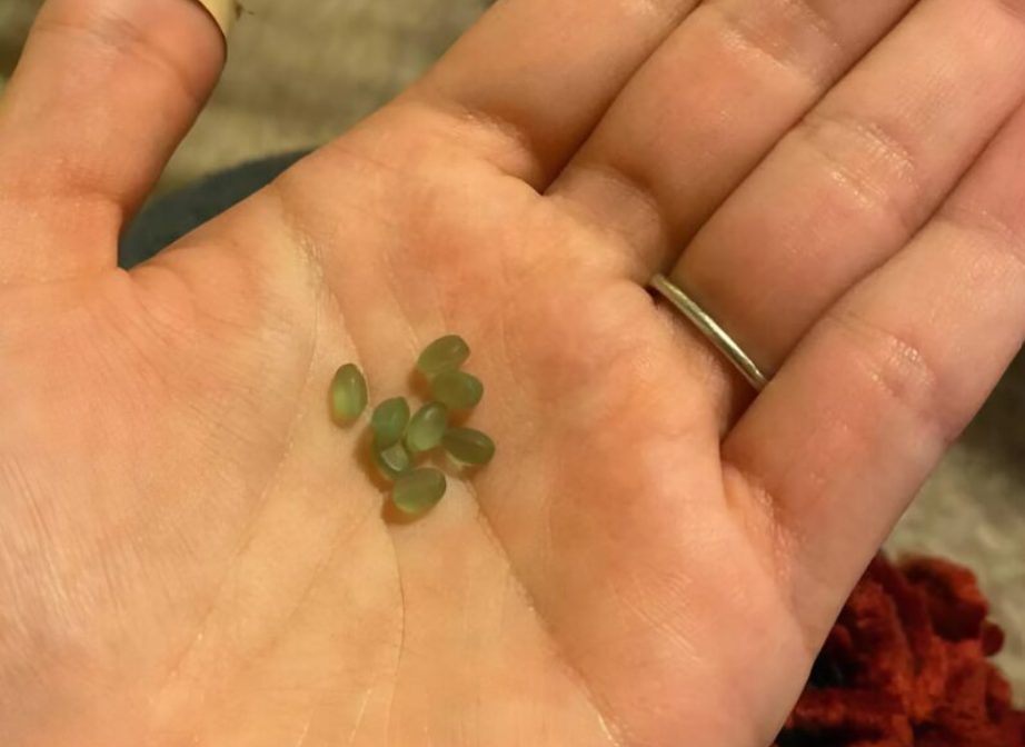 Il s’est avéré que ces perles vertes étaient d’anciens désodorisants pour distributeurs. Dans le temps, certains supports de papier toilette en plastique incorporaient ces billes odorantes pour embaumer l’air ambiant.