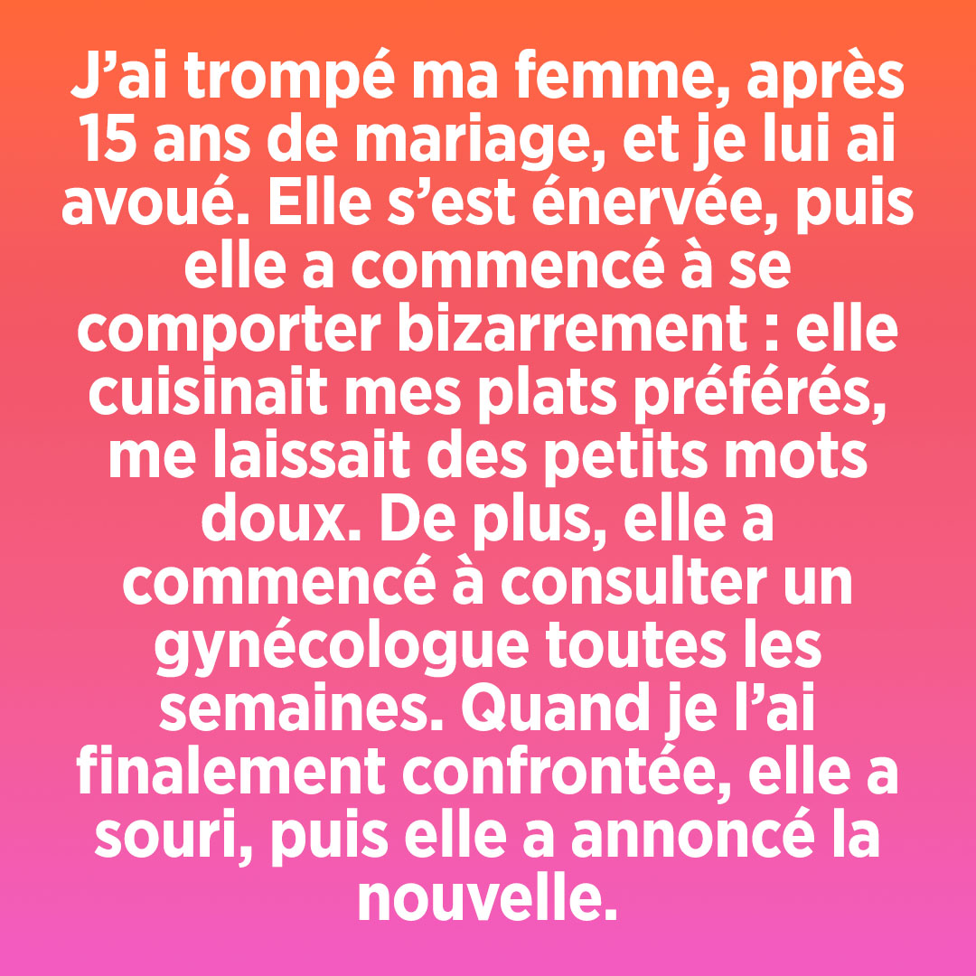 À ce moment précis, un tourbillon d’émotions contradictoires m’a envahi : une joie fulgurante, une honte renouvelée, une peur panique, mais surtout, une gratitude immense et nouvelle. D’un coup, son comportement des dernières semaines prenait une tout autre signification. Sa sérénité, sa patience retrouvée, ses attentions n’étaient pas un pardon facile ou un oubli, mais une volonté farouche de protéger la vie qui grandissait en elle et de préserver l’essentiel de notre lien.