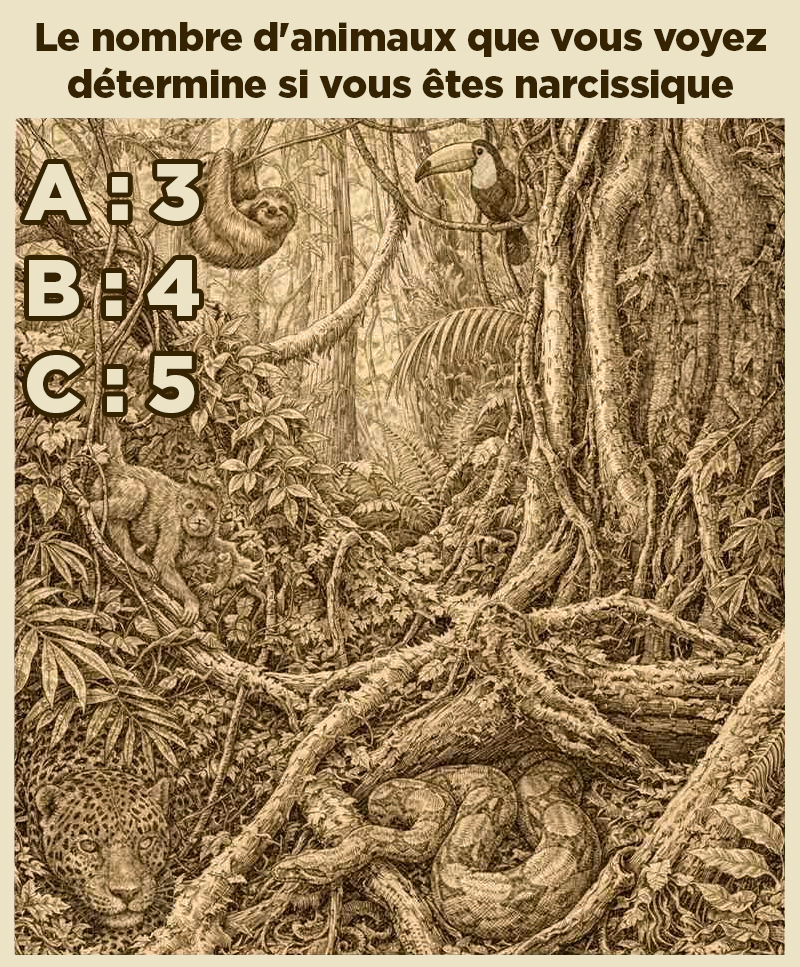 À première vue, on croirait contempler une scène de forêt tropicale tout à fait classique. Des lianes enchevêtrées, une canopée touffue, des jeux d’ombre et de lumière qui composent un tableau presque anodin. Mais si l’on s’attarde un peu, l’image se métamorphose : un perroquet se devine sur une branche, un paresseux se fond dans les feuillages, un singe espiègle se cache, un serpent se love discrètement et même la silhouette d’un félin peut apparaître. Ce qui semblait être un dessin ordinaire se transforme alors en un passionnant défi d’observation, et une question s’impose : combien d’animaux avez-vous réellement repérés ?