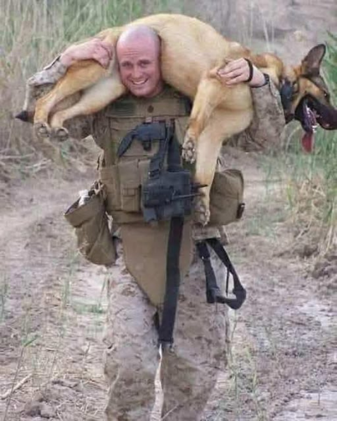 Enfin arrivé en sécurité, il dépose délicatement le chien, le rafraîchit, surveille son état. L’animal, épuisé mais sain et sauf, se serre contre lui. Un instant intense, silencieux, immortalisé plus tard par quelques clichés partagés entre frères d’armes. Pour ceux qui ne savent pas, ce n’est peut-être qu’« un homme qui porte un chien ». Mais pour ceux qui comprennent, c’est bien plus que ça.