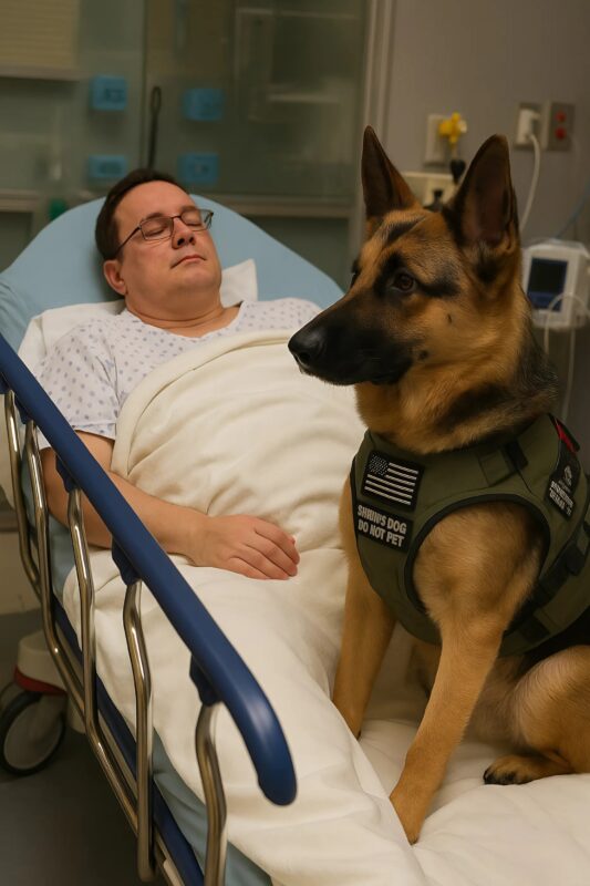 À quelques mètres de là, dans le corridor, son plus loyal compagnon attendait patiemment. Ce n’était pas un confrère en tenue, mais un magnifique chien de race berger allemand, à la fois coéquipier professionnel et ami indéfectible. Depuis le commencement de cette hospitalisation, il montait une garde silencieuse devant cette porte fermée, comme s’il saisissait intuitivement la sévérité de la situation.