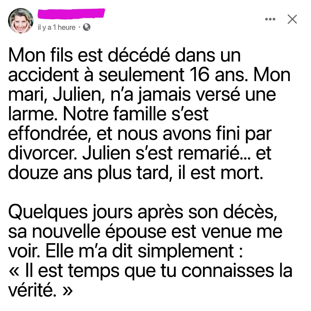 Une douzaine d’années plus tard, j’ai appris son décès brutal. Contre toute attente, la peine m’a rattrapée avec une violence oubliée. Quelques jours après les obsèques, on a frappé à ma porte : c’était sa seconde femme. La voix tremblante, elle m’a dit qu’elle devait me confier quelque chose d’essentiel.