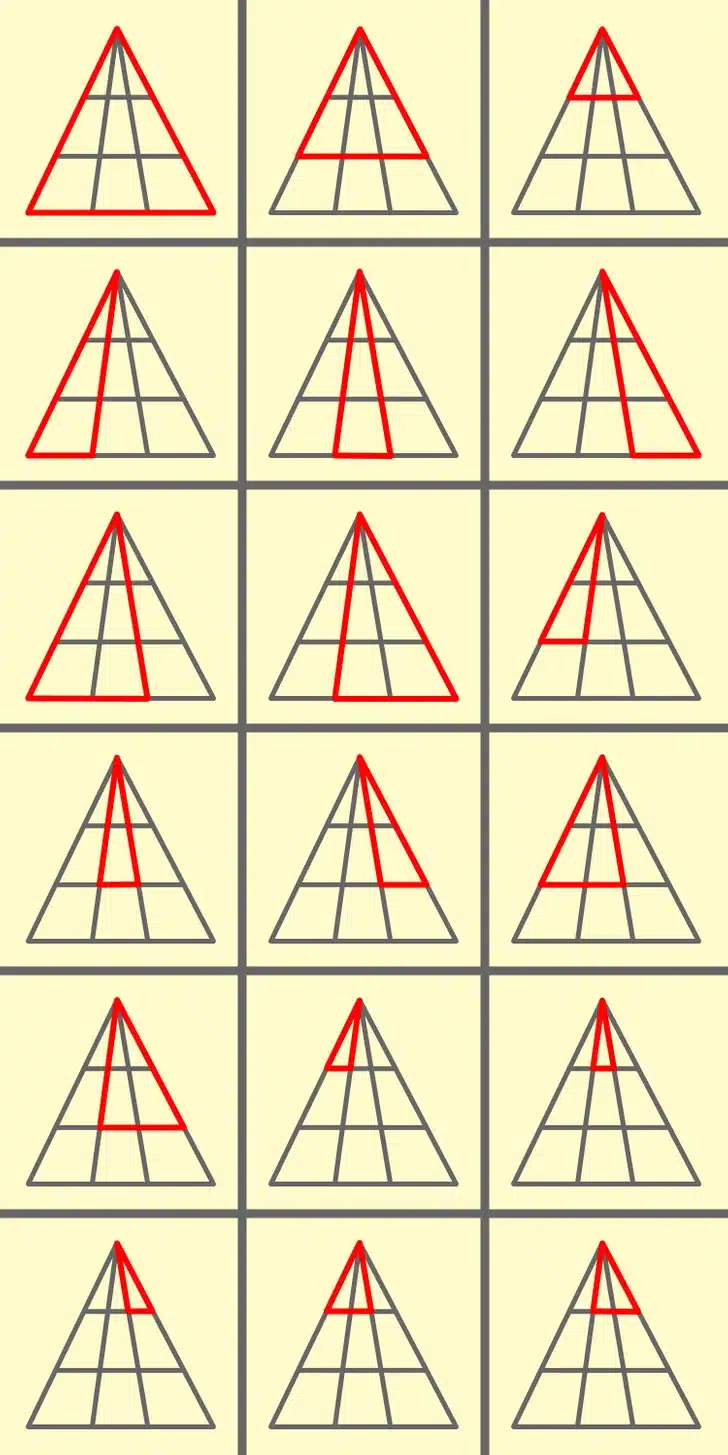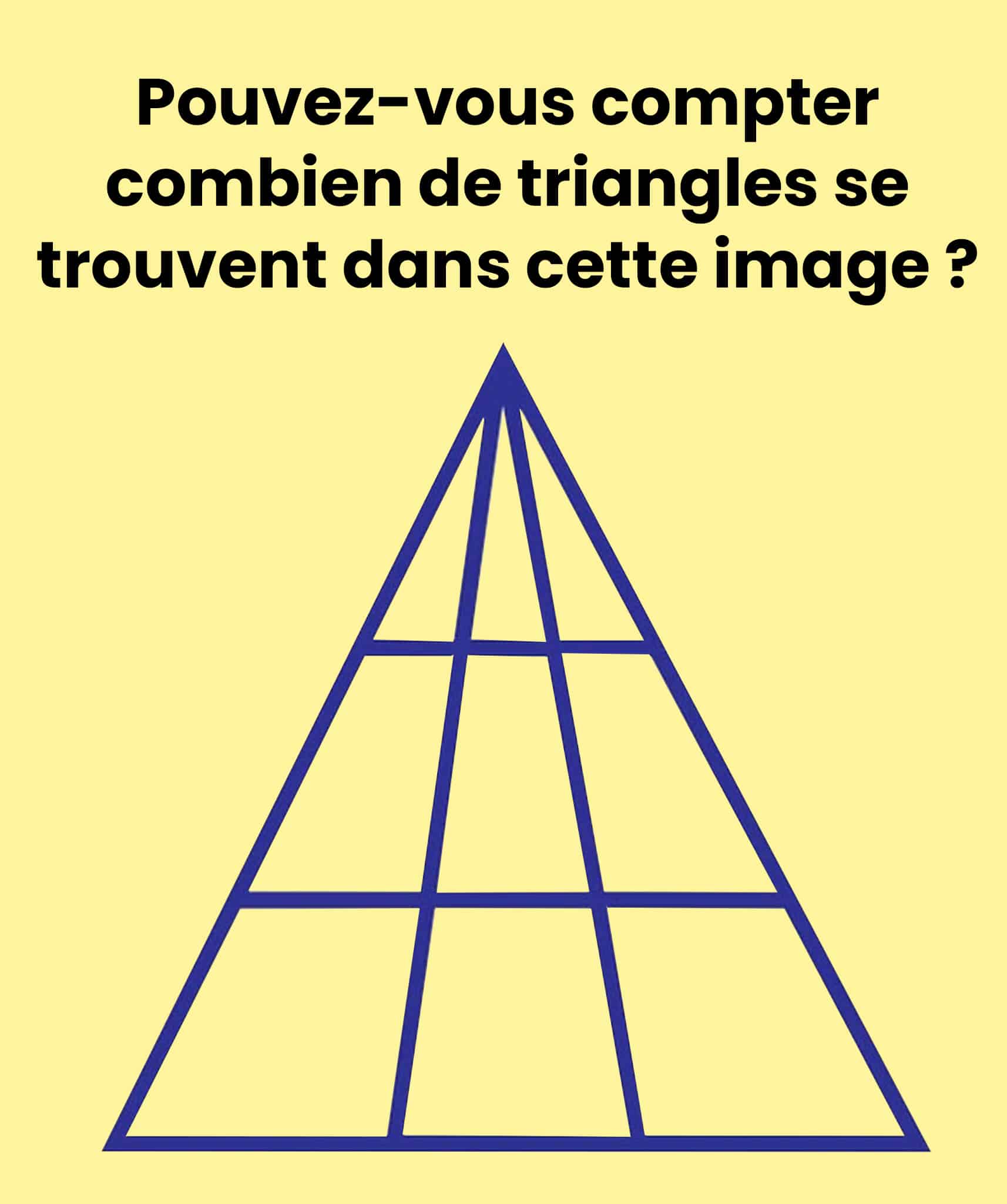Maintenant que vous connaissez les pièges et la méthode, c’est à vous de jouer. Reproduisez ce triangle segmenté, ou cherchez une version en ligne de ce célèbre défi de l’émission britannique Club 1 %. Prenez votre temps, concentrez-vous, observez bien. Le nombre total est de 18. Oui, 18 ! Si vous les trouvez tous, votre sens de l’observation est exceptionnel et votre logique est vraiment affûtée.