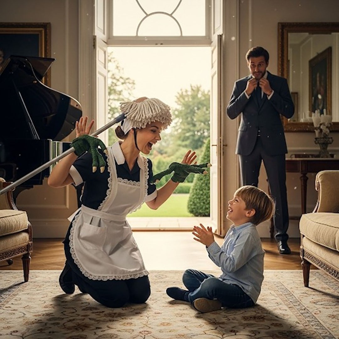 De retour plus tôt que prévu d’un voyage, Julien souhaite faire une surprise à son fils. Il entre discrètement dans la maison, un cadeau à la main, et s’arrête net dans l’entrée. Dans le salon, Camille mime un dinosaure maladroit, un torchon sur la tête, en poussant des grognements amusants. Léo éclate de rire… et la serre contre lui en murmurant :