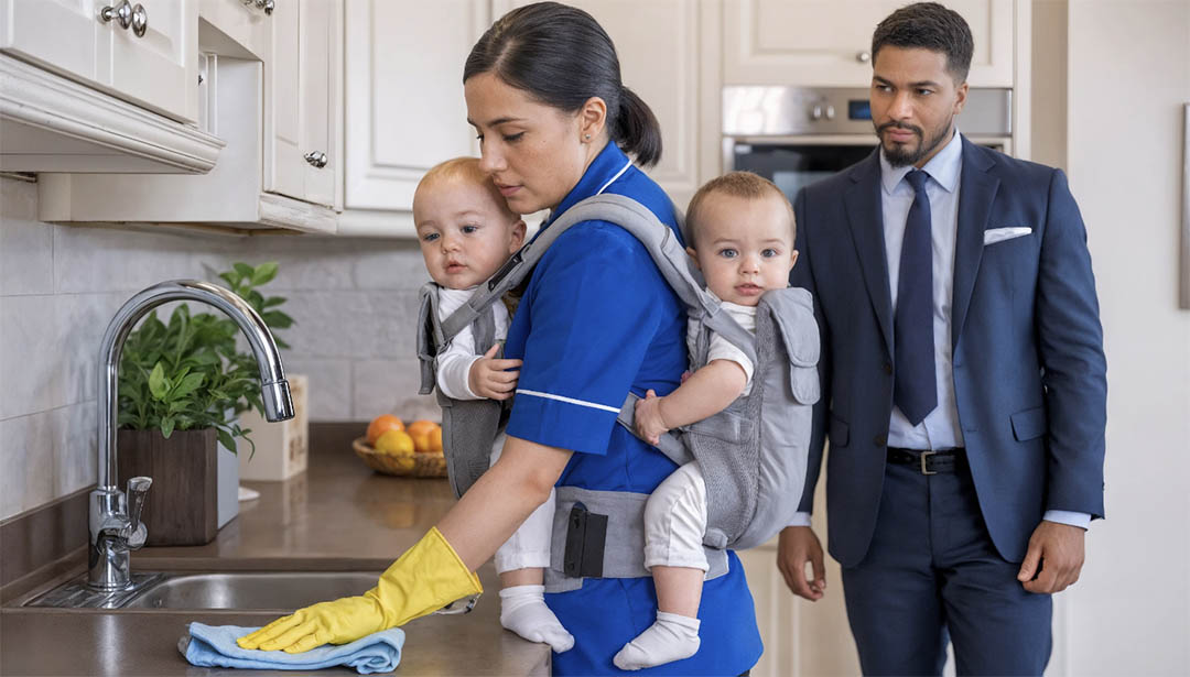 Tout a débuté par un cri inattendu. Thomas Reynaud, un influent entrepreneur parisien, a été saisi en entrant dans la chambre de ses jumeaux. Là se tenait Claire Martin, la femme de ménage récemment embauchée, qui nettoyait le sol tout en apaisant les deux enfants dans un tissu chamarré. L'un dormait paisiblement sur son dos, tandis que l'autre babillait contre sa poitrine. Pour la première fois depuis cinq mois, les pleurs avaient laissé place à la tranquillité.