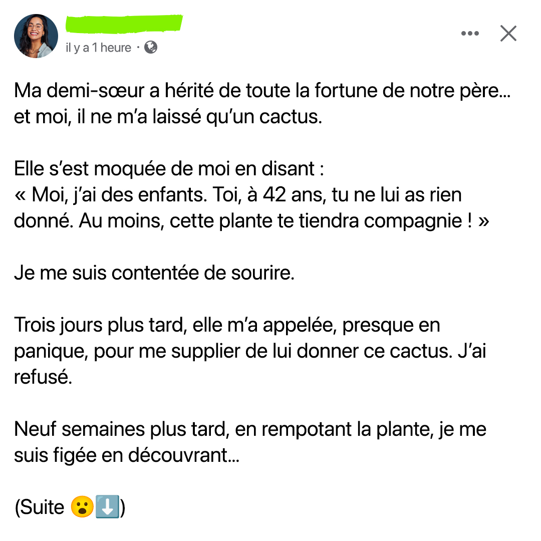 Un cactus, celui-là même qui avait veillé des années sur le rebord de la fenêtre de mon père, incliné vers le soleil avec une obstination tranquille. Un sourire mi-amusé, mi-apitoyé a effleuré les lèvres de ma demi-sœur. Elle, avec sa famille et ses projets, recevait les fondations d’une vie. Moi, célibataire et établie à 42 ans, je repartais avec une plante grasse.