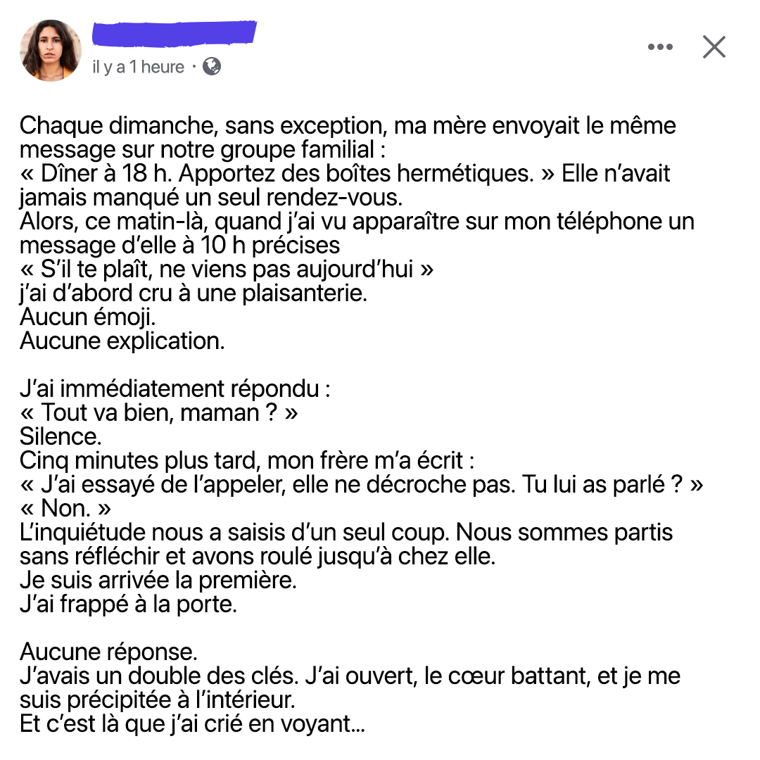Quand ce SMS a vibré sur mon téléphone — « S’il te plaît, ne viens pas aujourd’hui » —, un froid m’a parcourue. L’absence d’explication, la formulation inhabituelle, tout semblait alarmant. Mon frère et moi avons échangé un regard chargé d’inquiétude : sans discuter, nous avons pris la route.