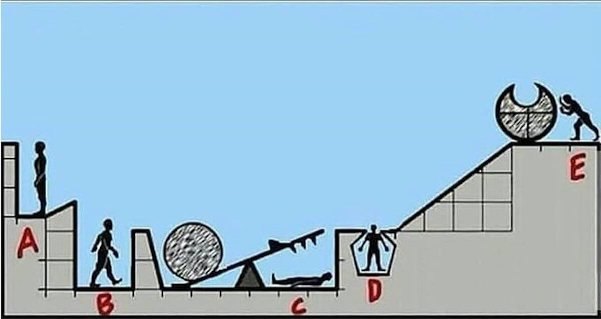 Voici le décor : E s’apprête à faire glisser un rocher qui semble prêt à dévaler une pente. Juste en dessous, D est coincé, seule sa tête dépasse. À proximité, une planche posée en équilibre précaire soutient une autre pierre à l’une de ses extrémités ; en dessous de la partie surélevée, C est allongé. Un peu plus loin, B et A observent. Le piège ? Résister à la distraction des détails superflus et se concentrer sur la trajectoire de la chute, le point d’appui de la planche et la logique du mouvement des pierres.