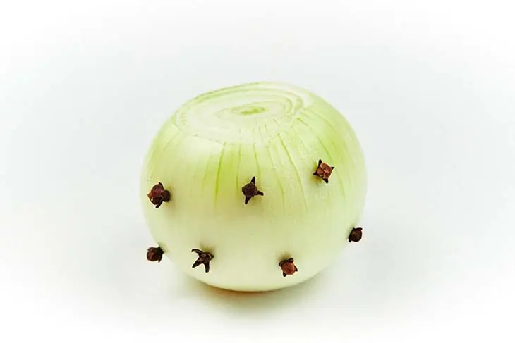 2. Enfoncez **entre 5 et 10 clous de girofle** dans chaque demi-oignon, en les espaçant bien.