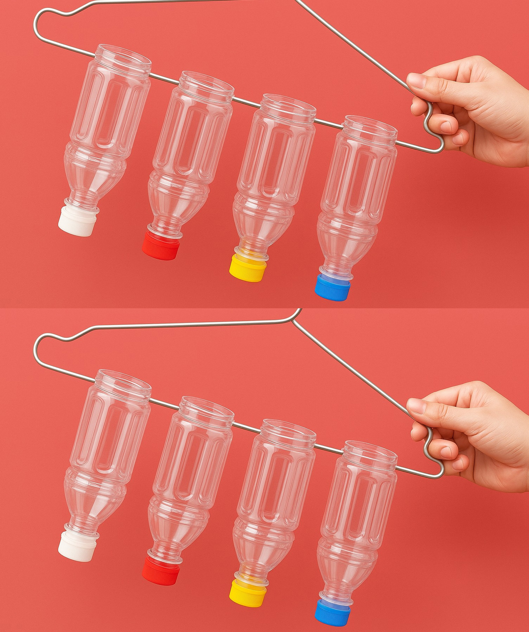 Assemblez des bouteilles coupées (goulot vers le bas) sur un support métallique pour créer un organisateur mural sans travaux. Parfait pour ordonner produits de beauté, matériel de bureau ou jouets d’enfants.