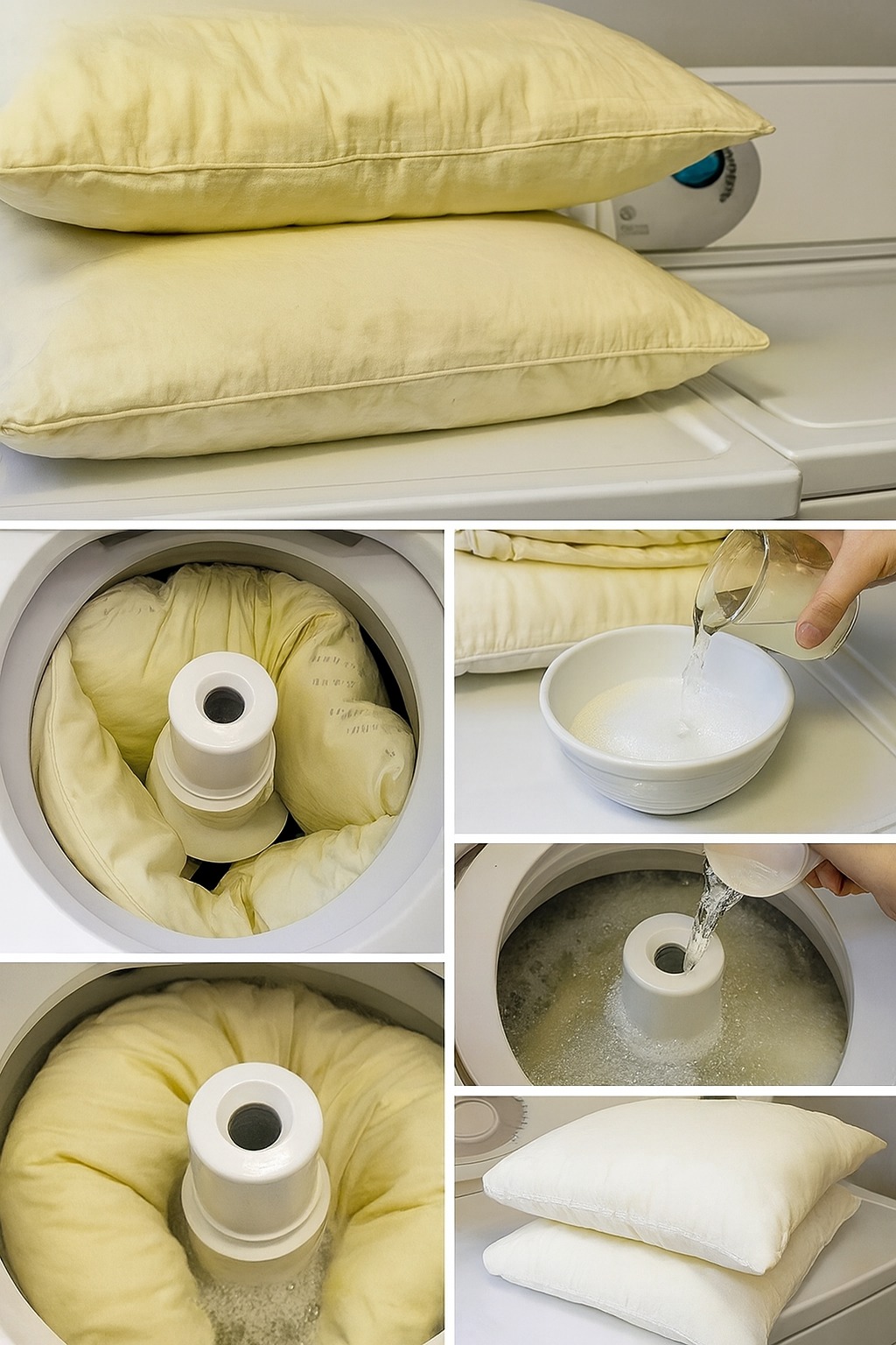 - Faites tremper l’oreiller pendant une heure, puis rincez-le en machine avec un cycle court et doux.