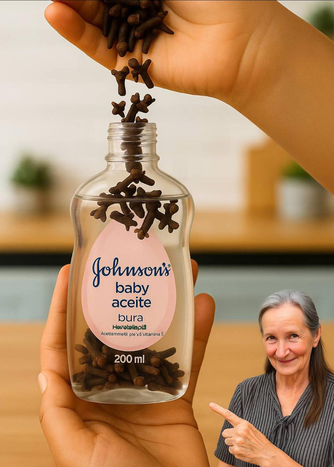 Une bouteille d'huile pour bébé et des clous de girofle sur une table, illustrant les ingrédients de la recette.