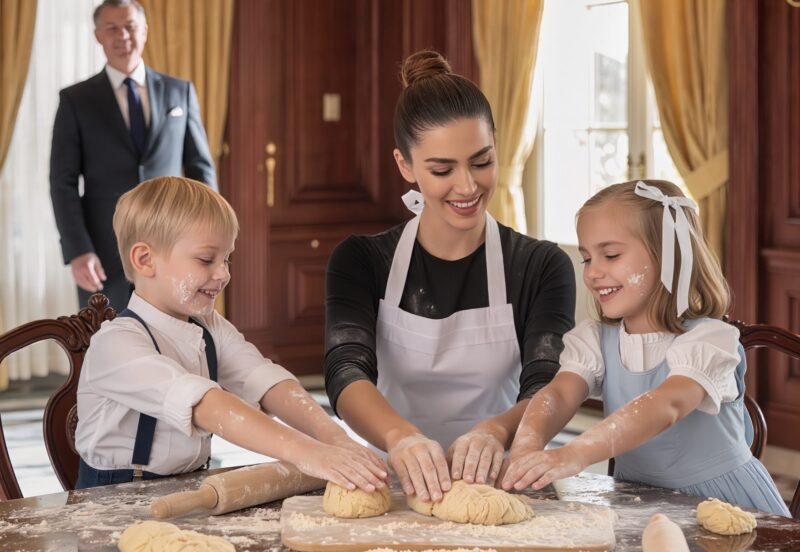 La pièce, d’ordinaire si impeccable, était recouverte d’une fine couche blanche : de la farine. Léo et Camille, le visage barbouillé de pâte, riaient aux éclats tandis que Clara leur enseignait les secrets du pétrissage maison. Elle avait retroussé ses manches, le visage rayonnant, et lançait de petites boulettes de pâte sous les cris enthousiastes des enfants.