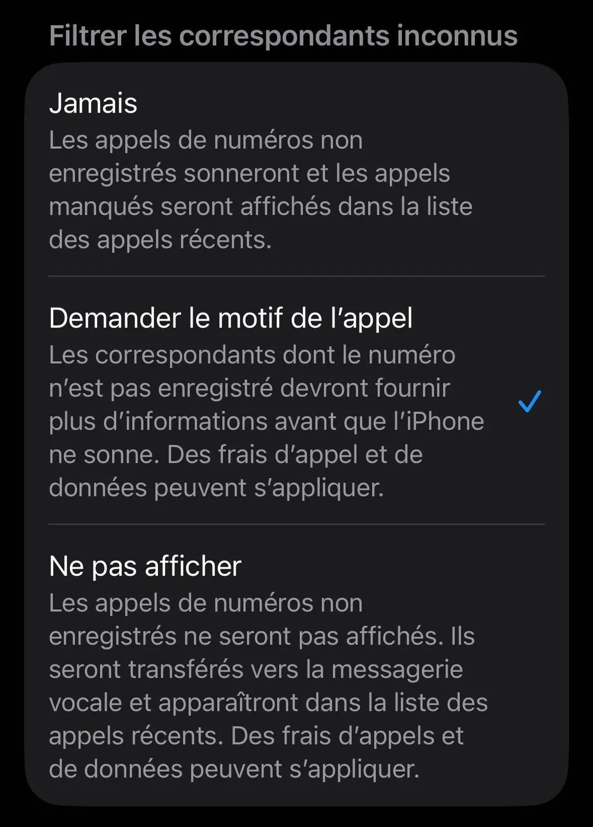 - Ne pas afficher : Les appels masqués ou non identifiés sont redirigés en silence vers votre boîte vocale. Votre écran ne s’allume même pas, une option parfaite pour les moments où vous avez besoin de vous concentrer.
