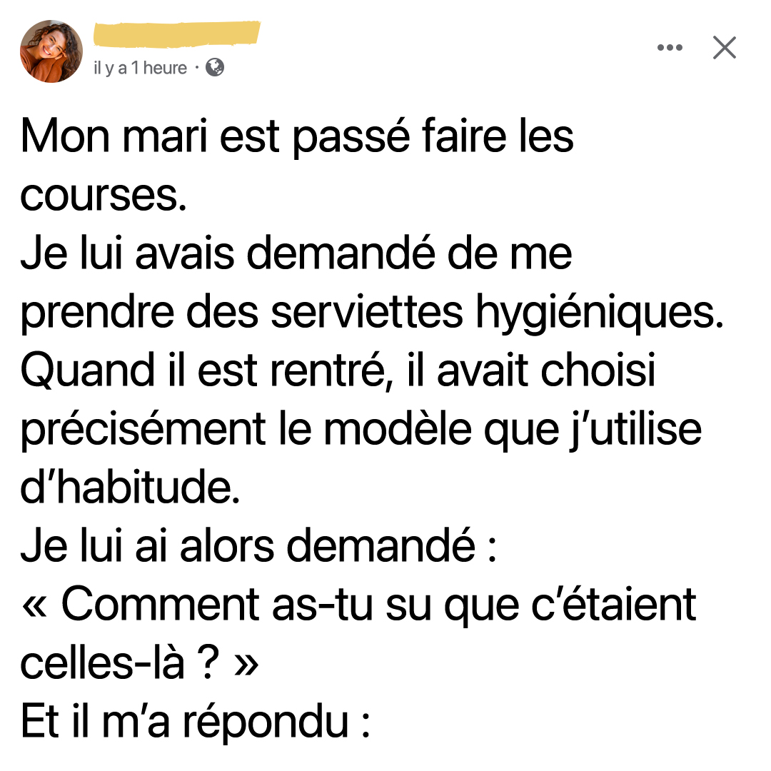 Quand mon mari est parti faire les courses, je lui ai simplement demandé, au passage, de prendre des serviettes hygiéniques. Honnêtement, je m’étais déjà préparée à la scène classique : messages affolés depuis le rayon, photos floues, hésitations interminables. J’avais presque anticipé le fou rire… ou la résignation.