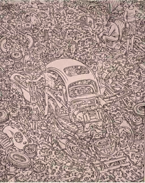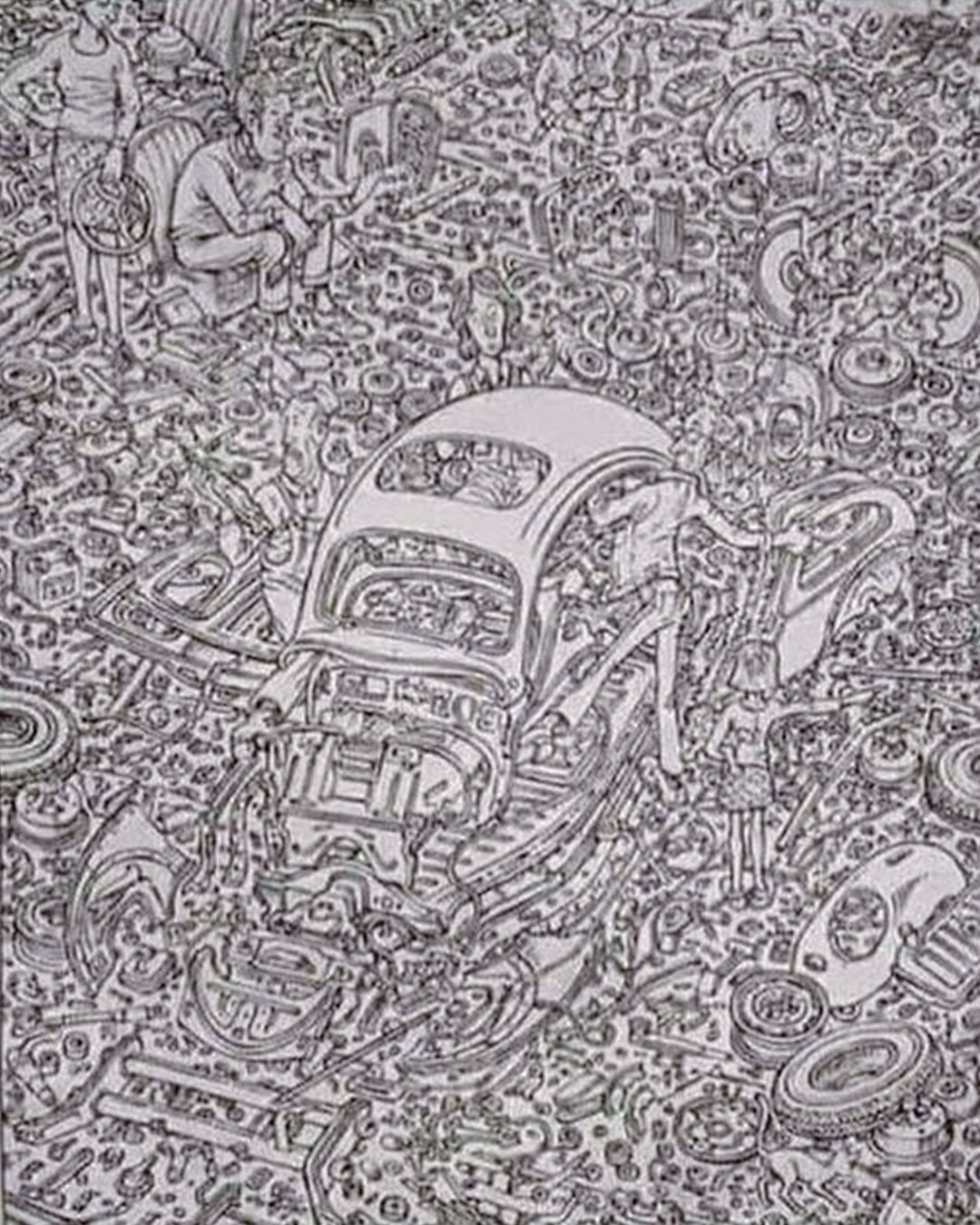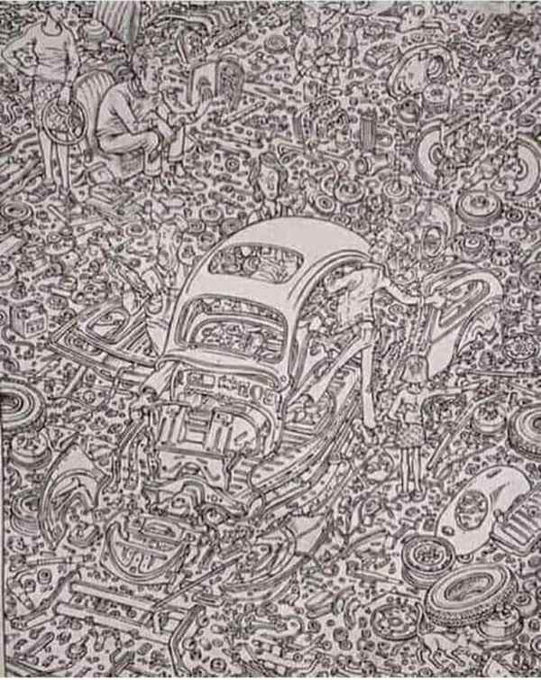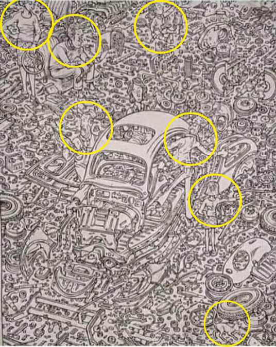 Au premier coup d’œil, cette illustration ressemble à un fatras de pièces mécaniques, de rouages et de métal entassés dans un atelier. Mais en y regardant de plus près, cette composition est bien plus maligne qu’elle n’en a l’air. Six personnages et un chat s’y dissimulent avec malice, se fondant dans le décor pour semer le trouble. Ce type d’image est conçu pour éprouver notre capacité à repérer des formes familières dans un environnement embrouillé, un peu comme une illusion d’optique.